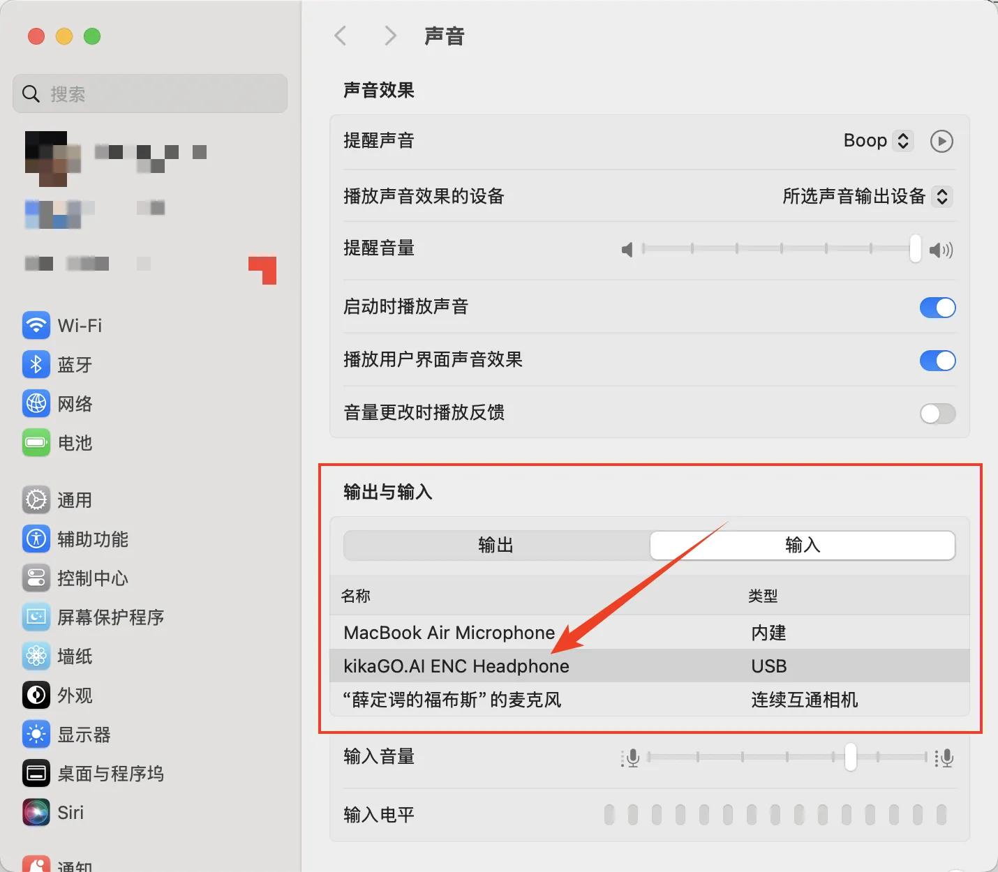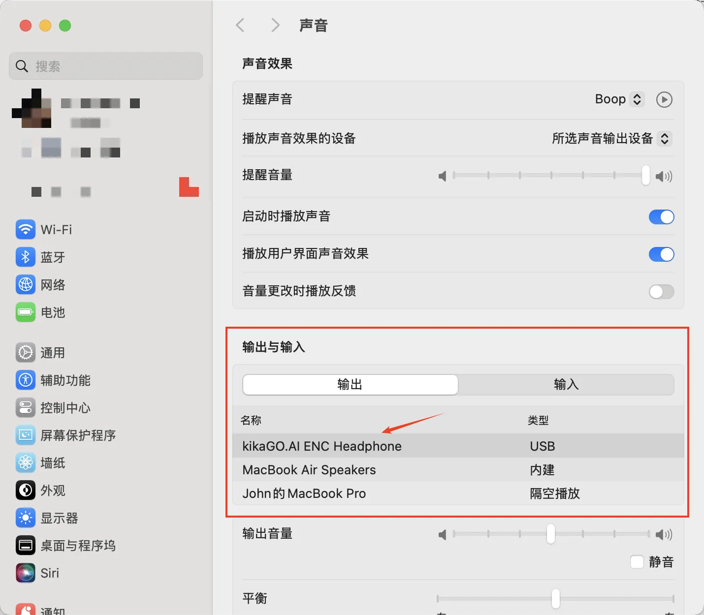 - 在开始翻译前,您需要检查Mac电脑音频输入输出是否选择到kikago.ai enc headphone